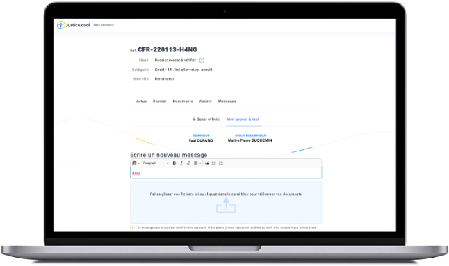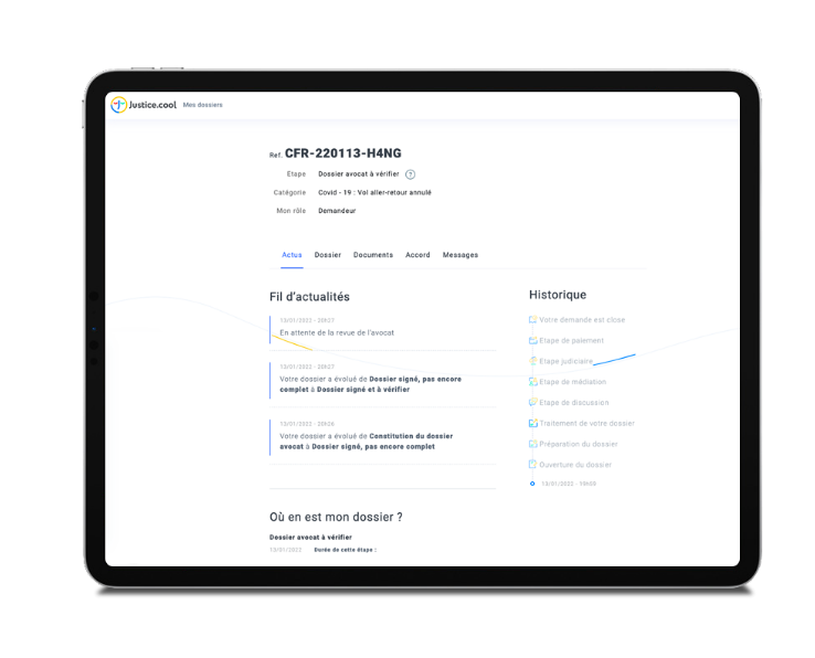Justice.cool centralise ainsi dans un souci de simplicité, l’ensemble des informations, des documents, des échanges et des évolutions de votre procédure en un seul et même endroit. Vous suivez ainsi plus simplement l’évolution de votre dossier et les échanges entre tous les intervenants qui y participent.